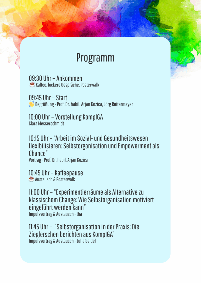 Der Thementag richtet sich an Fach- und Führungskräfte sowie Organisationsentwickler*innen aus dem Sozial- und Gesundheitswesen sowie an alle, die neue Wege der Arbeitsgestaltung kennenlernen und mitgestalten möchten.